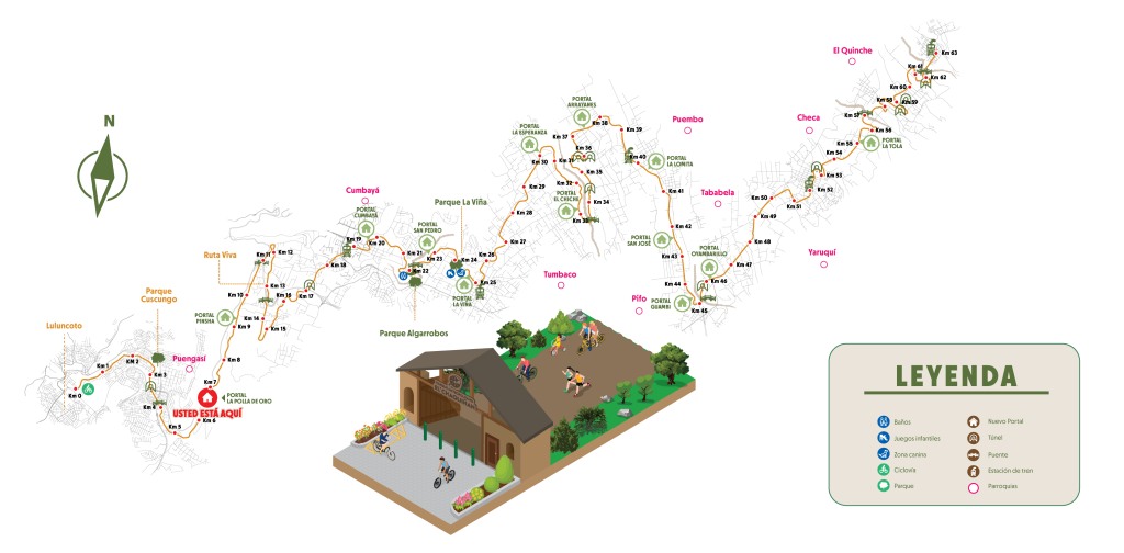 En el valle de Tumbaco existe la ruta Ecológica de El Chaquiñán, misma que trascurre por la antigua vía férrea. Esta se divide en tres tramos: el primero desde el sector de la Pasteurizadora Quito hasta Cumbayá con 20 Km, el segundo desde Cumbayá a Puembo con una extensión de 20 Km, y un tercero desde Puembo hasta El Quinche con 23 Km. 63 km en total. Lo que le ha hecho convertirse en uno de los parques lineales más largos de Sur América. En el año 2014 se construyó el parque y sendero ecológico Algarrobos que tiene cuatro hectáreas de bosque seco interandino. Está lleno de árboles conocidos como algarrobos, de ahí su nombre.